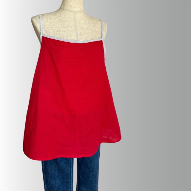 胸のカーブが浅い面と深い面があります。どちらも前にできますので、お好みでご着用ください。 ◎カラー:Red×Gray ◎素材:オーガニックコットン100% 春夏に心地よいダブルガーゼです。 吸水性や通気性がよく、汗をかいても快適にお使い頂けます。 《お取り扱いのご注意》 *濡れたまま長時間放置しますと、色落ちや他の部分へ色移りする恐れがあります。 *濃色は、洗濯の際の摩擦により色移りや色が徐々に白っぽく薄くなる恐れがあります。白や薄い色のものと分けてお洗濯してください。 *洗濯時は洗濯ネットをご使用ください。 *お洗濯後はシワを伸ばして干してください。 *タンブラー乾燥はお避けください。 *品質表示のタグは別途お付けいたします。お肌への負担を減らす為に縫いつけてはおりませんので、予めご了承ください。 ◎サイズ:着丈65cm、身巾100cm おおよそM〜Lサイズくらいです。 フレアなデザインなので、ゆったり着て頂けます。 インしやすい長めの着丈です。 *平置きでの寸法です。 サイズは縫製により、誤差が生じます。予めご了承くださいませ。