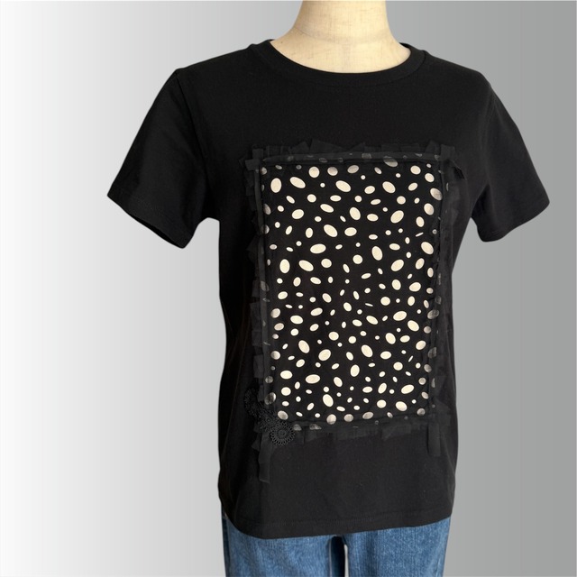 T-shirt:cotton100% ドット生地:cotton100% チュール:nylon100% size: 身丈65、身巾49、肩巾42、袖丈18 (cm)