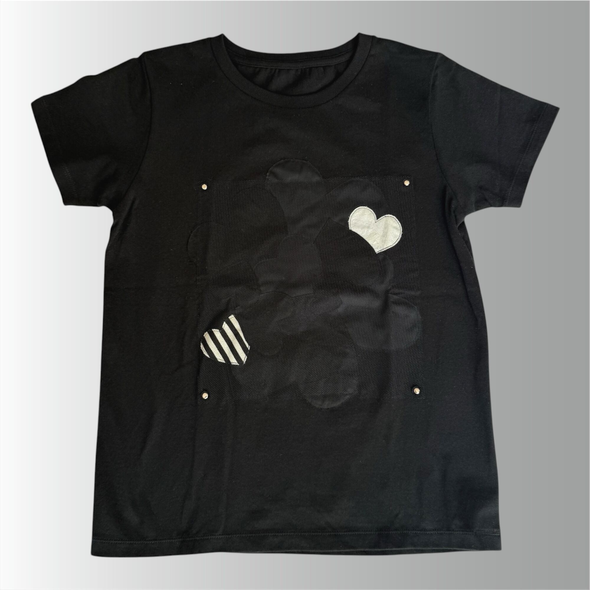 T-shirt:cotton100% ハート:cotton100% チュール:nylon100% カシメ:iron size: 身丈59、身巾43、肩巾36、袖丈16 (cm)