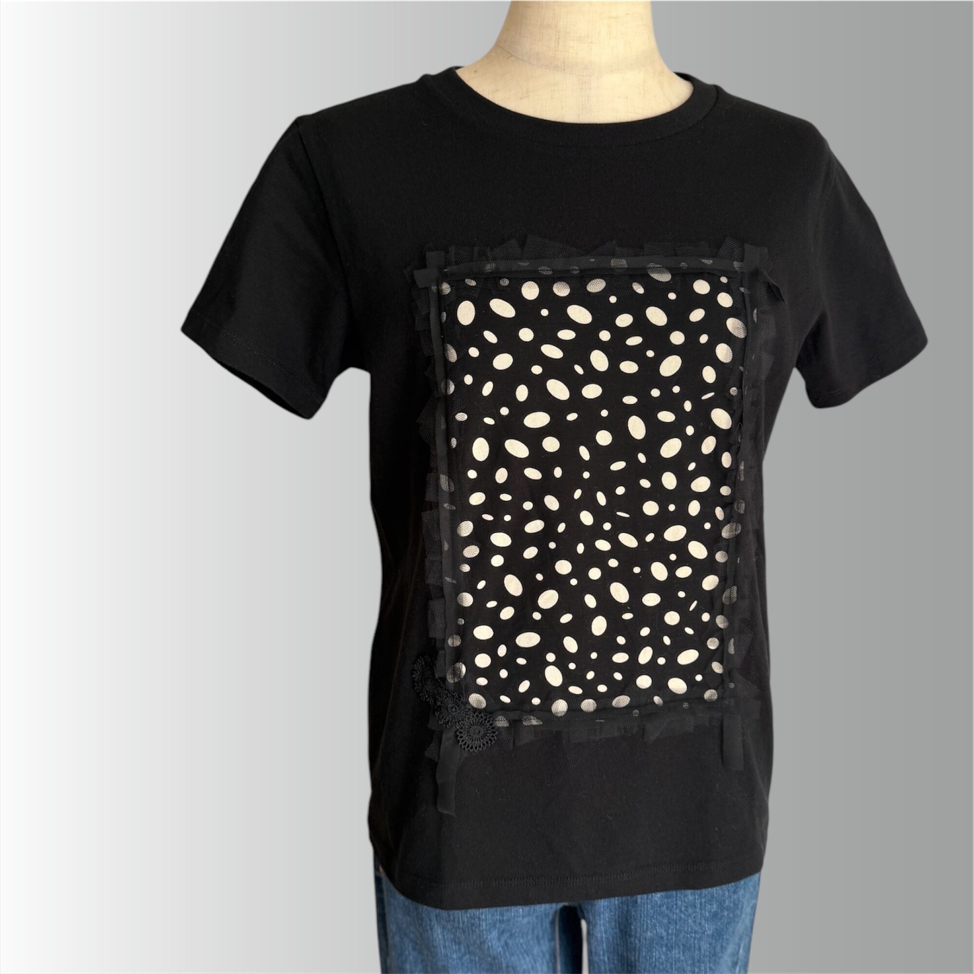T-shirt:cotton100% ドット生地:cotton100% チュール:nylon100% size: 身丈62、身巾46、肩巾39、袖丈17 (cm)