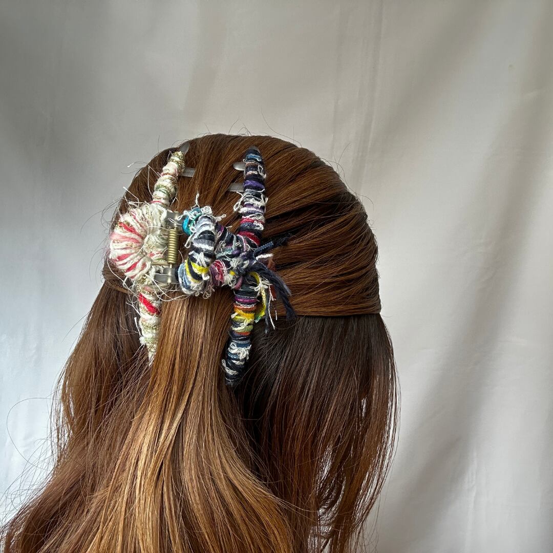 両サイドで異なる毛糸を使用した、楽しいヘアアクセサリー