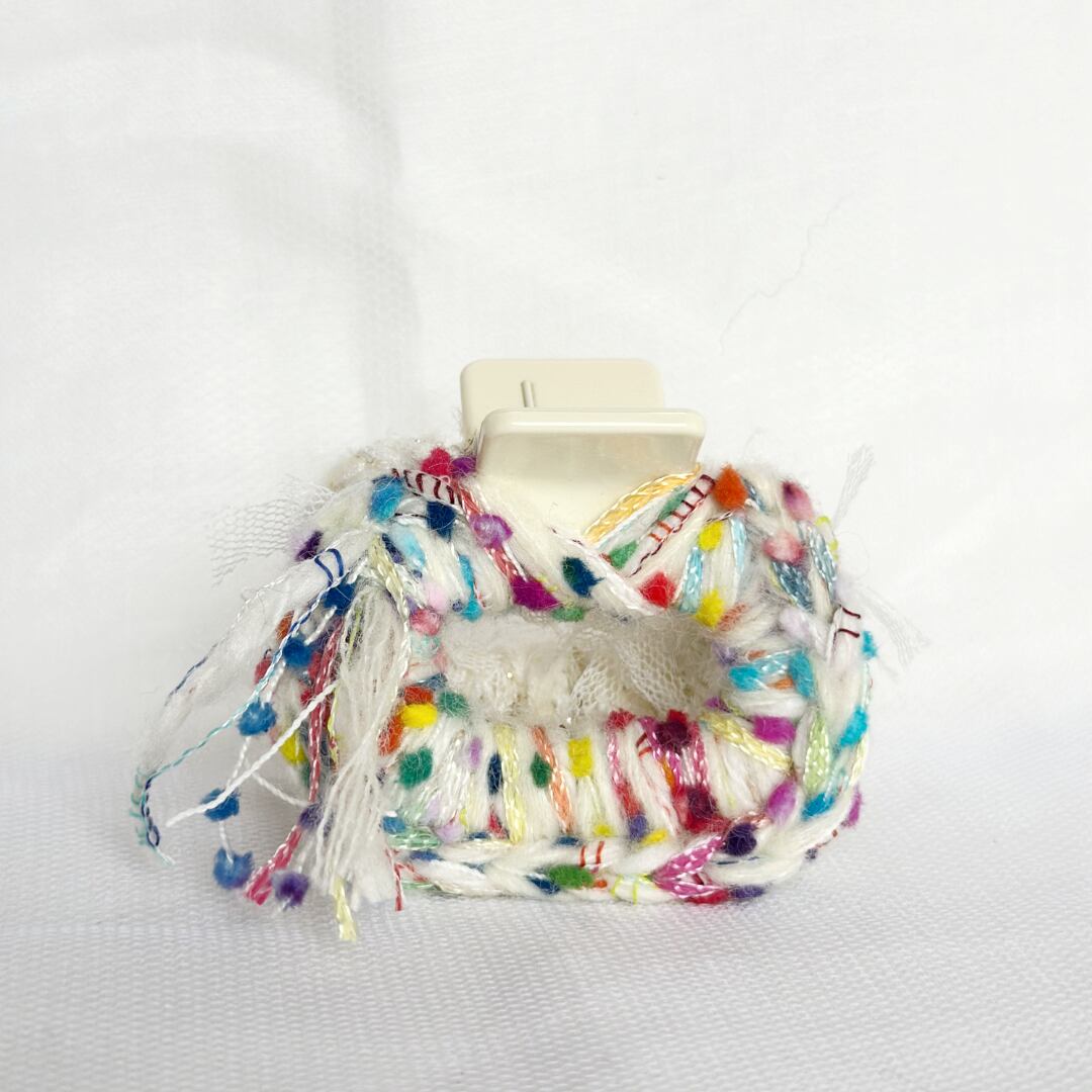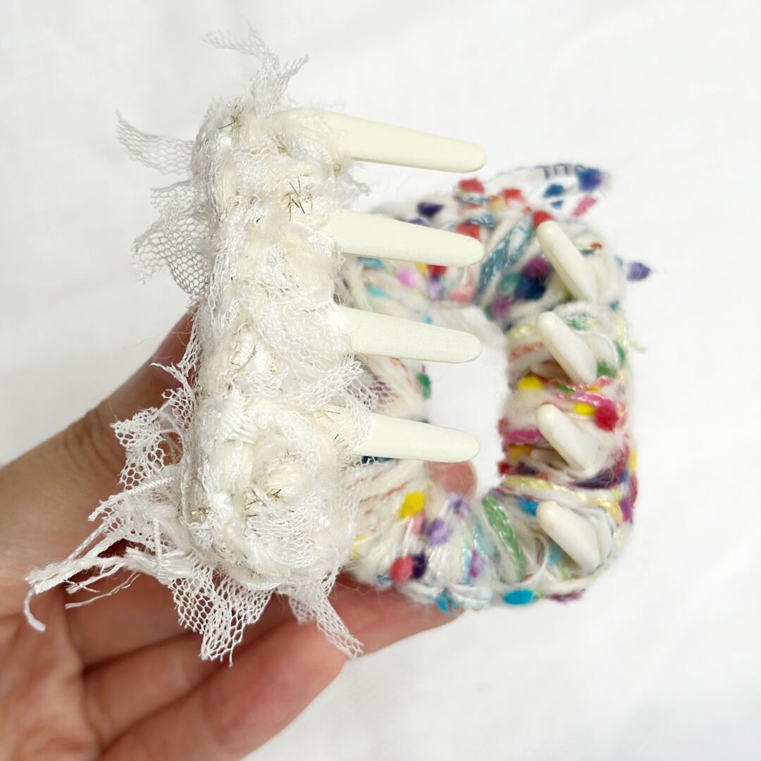 両サイドで異なる毛糸を使用した、楽しいヘアアクセサリー