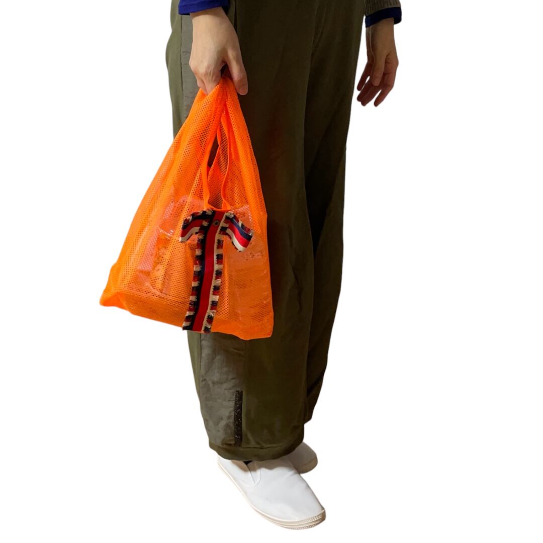 バッグの真ん中に付いているリボンを使って小さくたたむことができます。手のひらサイズなので、鞄の中に常備しやすいです。急なお買い物も安心!